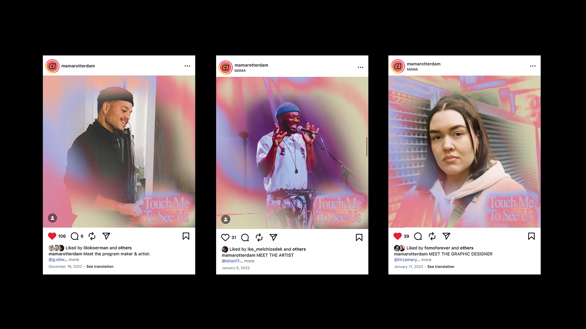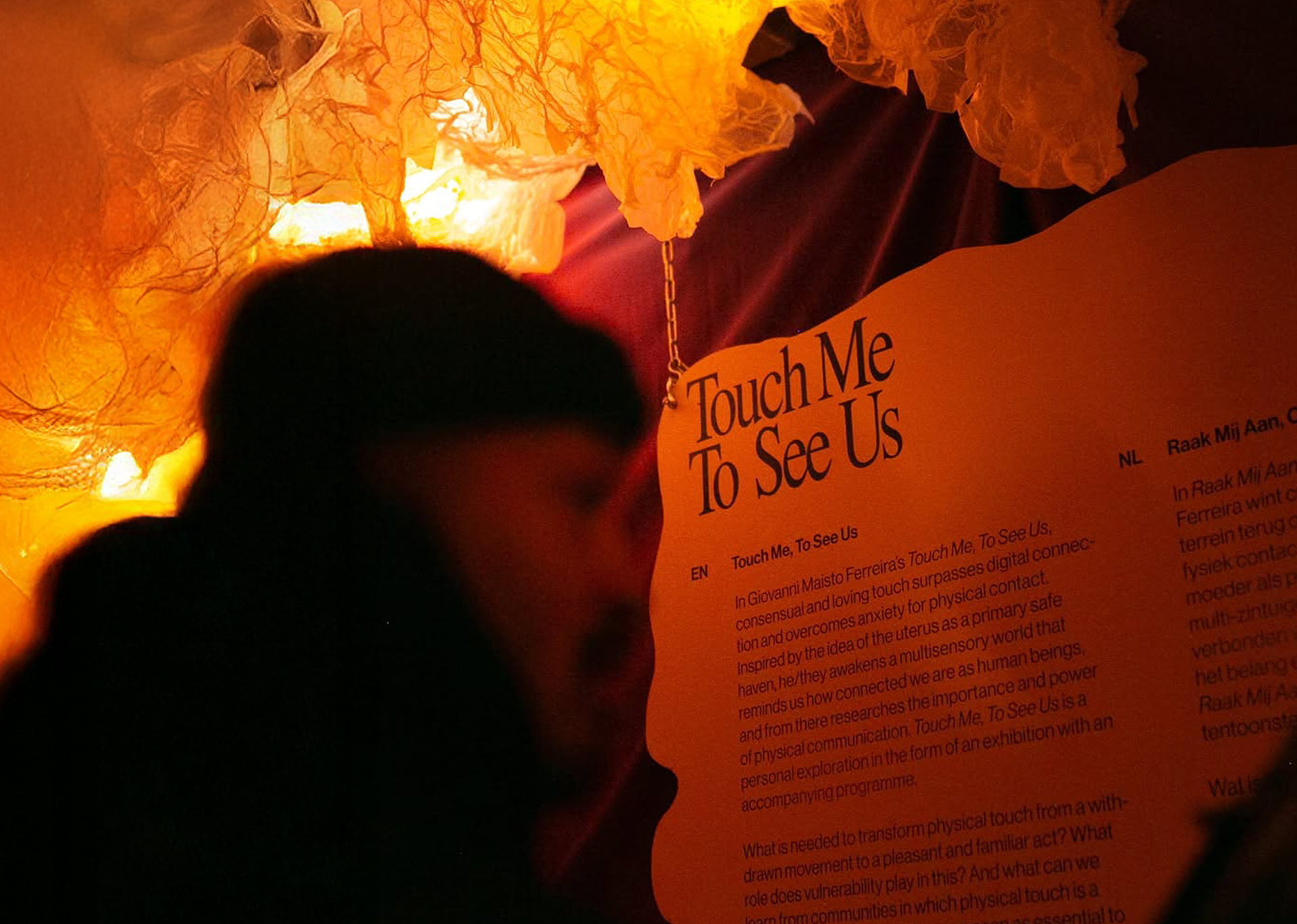 I worked on the branding and typography for an exhibition called 'Touch Me, To See Us' by Giovanni Maisto Ferreira. This exhibition aims to bring back consensual and interactive touch in the digital age and address the fear of physical contact. Inspired by the idea of the womb as a safe space, Maisto Ferreira created a sensory experience to highlight the importance of touch.