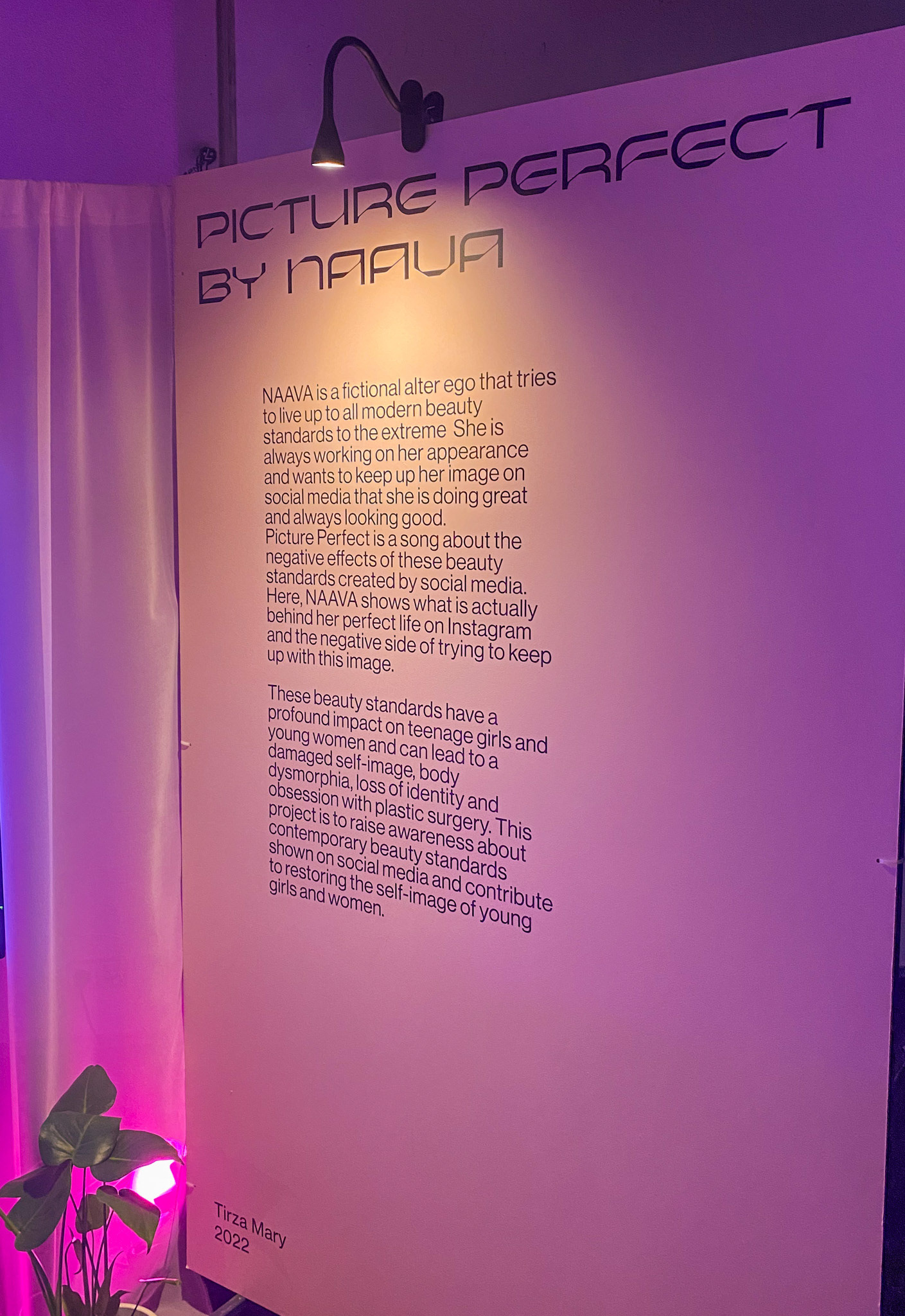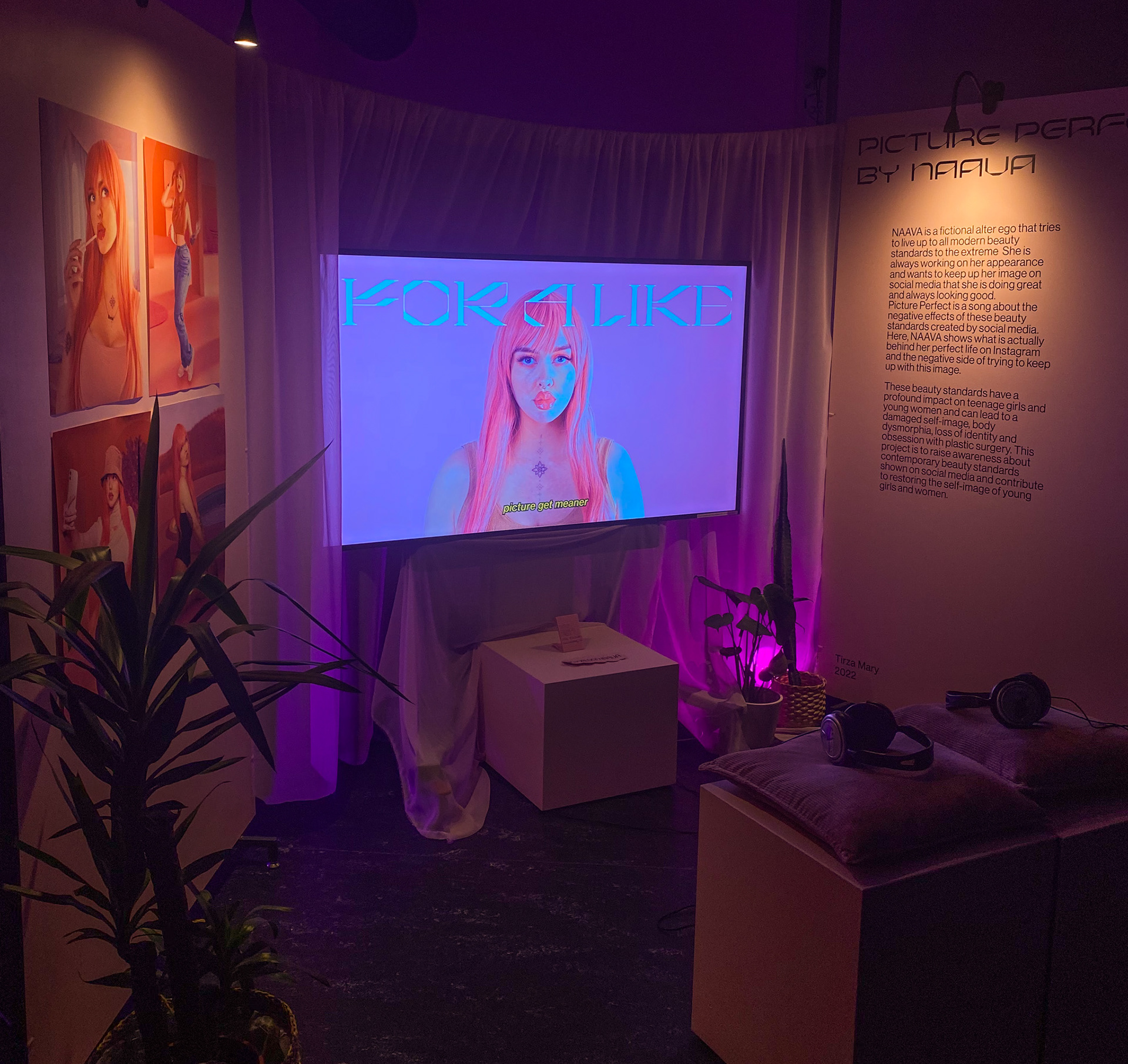 Concept, branding design, research and editing for my graduation project. The project focuses on "NAAVA," a character who goes to great lengths to meet modern beauty standards. In her song "Picture Perfect," she talks about how social media's beauty ideals can be harmful. The video shows how a heavily edited photo is transformed to reveal the real, unaltered image. NAAVA shifts between two worlds in the video: the idealized Instagram image and the unfiltered reality. By uncovering what's behind the photos, the project criticizes modern beauty standards and hopes to start a conversation that encourages young girls to embrace their natural beauty.